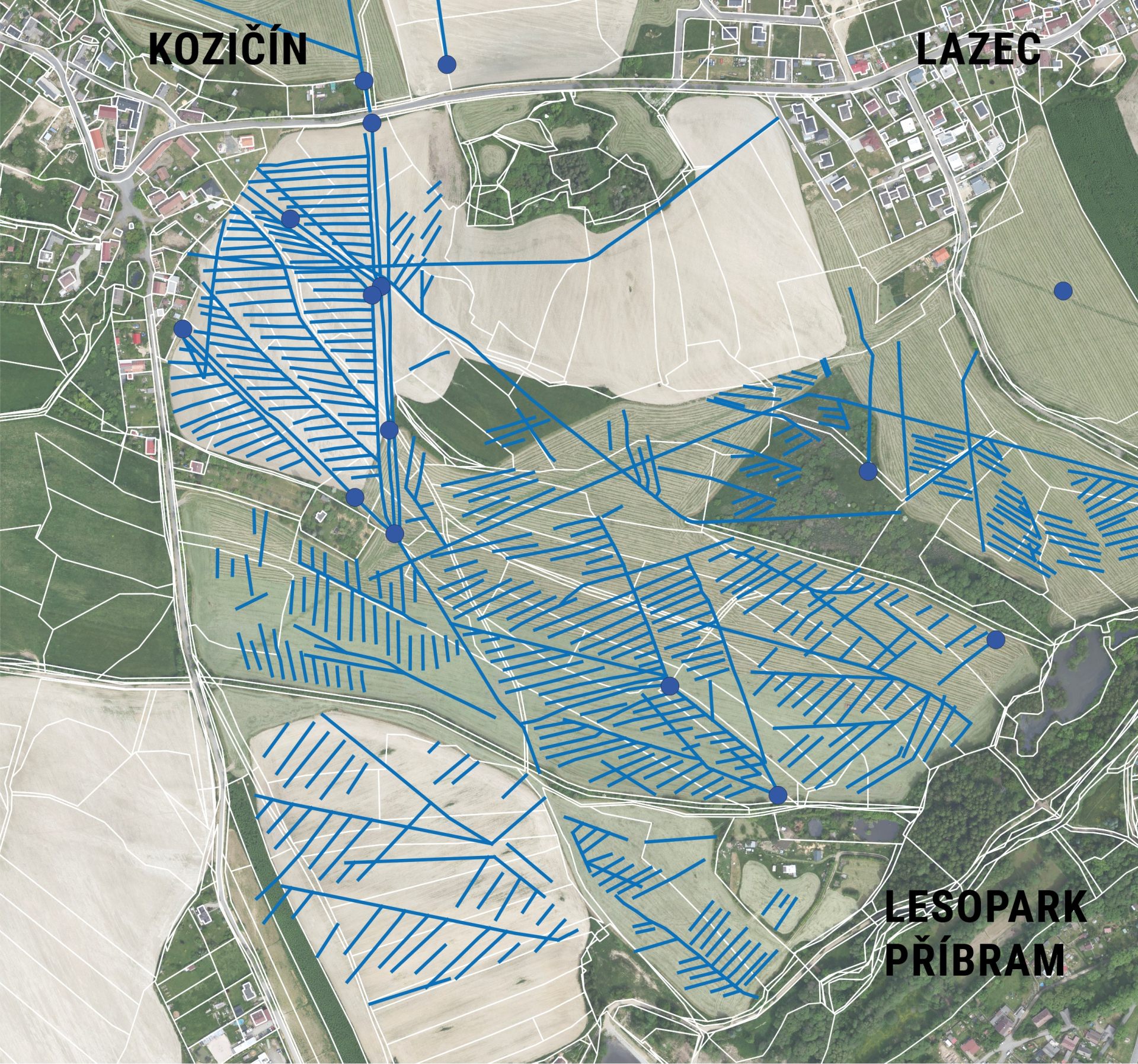 Mapa meliorací mezi lesoparkem Litavka, Kozičínem a Lazcem. Zdroj: studio-relinkt
